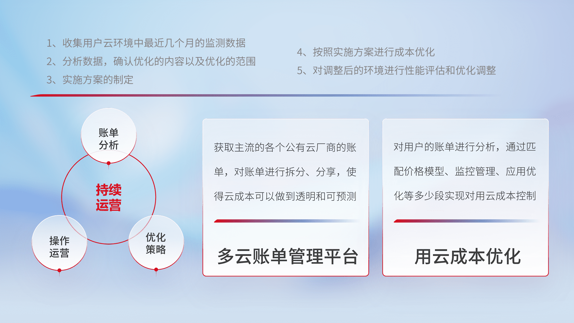 通过多云纳管,,,以统一的资源数据模型把客户的云资源进行抽象和封装,,,,进而实现对多云资源的统一操作,,,保障云资源管理的可靠性、、、稳定性与可用性。。量身定制化运维内容,,配置、、、开发运维、、、补丁管理、、、、备份、、、监控、、、、认证和访问管理、、、、审计和日常巡检等,,,,保障在用云过程中的可靠度,,稳定度以及高可用率。。。